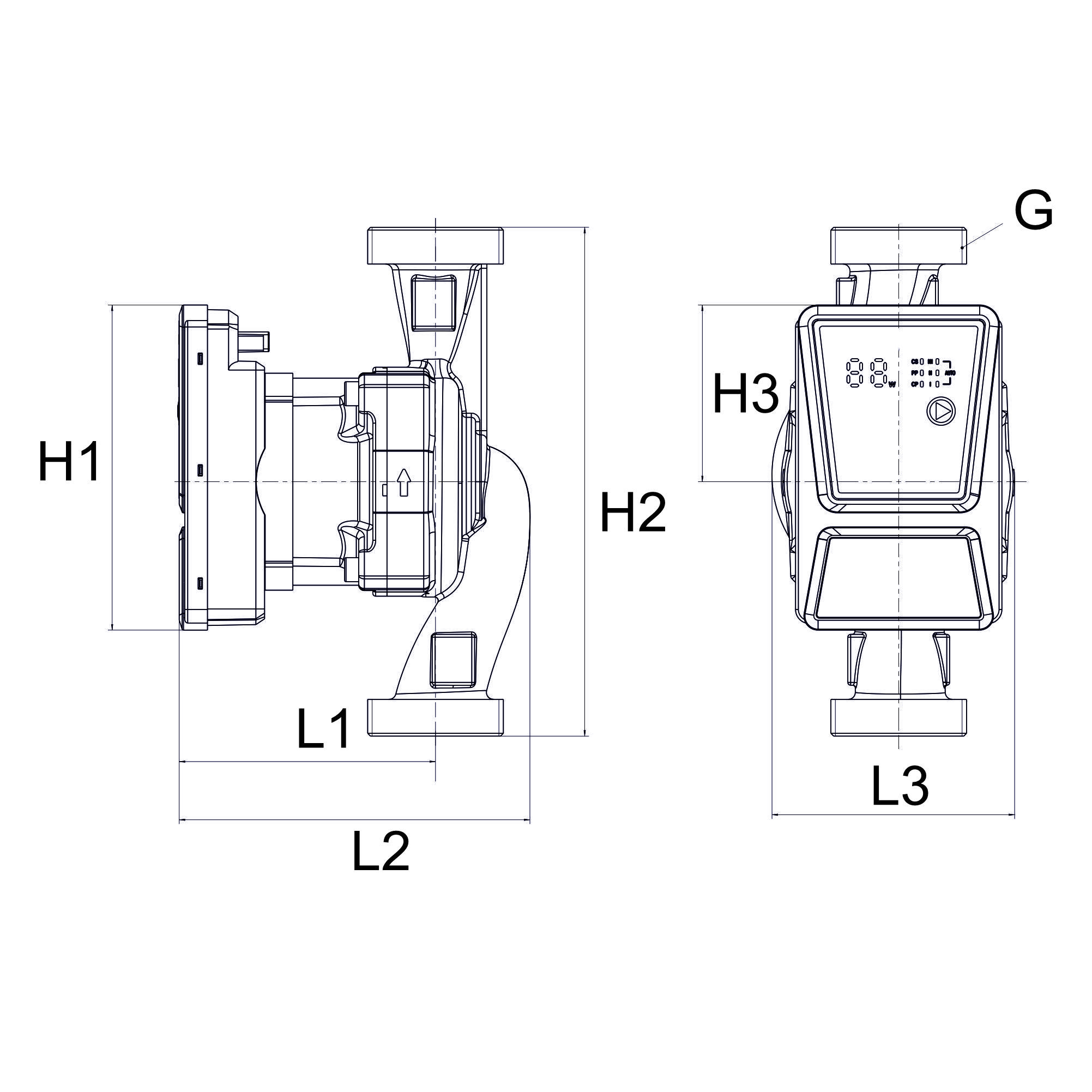 | Indeks | Typ pompy | L1 (m) | L2 (mm) | L3 (m) | H1 (mm) | H2 (mm) | H3 (mm) | G (cal) |